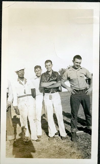 Fletcher (left) poses at the Oakland Speedway with (L-R) Bob Thompson, Gene Souza, and Bob Owen, c. 1950.